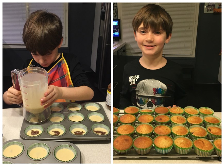 Des cupcakes, réalisés avec Mathis, sur une base de gâteau au yaourt avec un cœur de Nutella surmontés d’une chantilly mascarpone au Nutella pour l’un, et sur une base de financier avec des framboise au cœur et surmontée d’une ganache montée au chocolat blanc.
