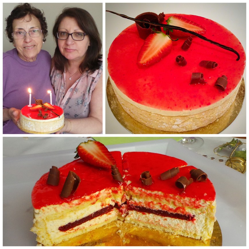 Pour fêter les 81 ans de ma grand-mère et les 58 ans de ma mère, j’ai réalisé un entremet composé d’un biscuit cuillère, d’une bavaroise à la vanille de Madagascar et d’un insert de confit de fraise.