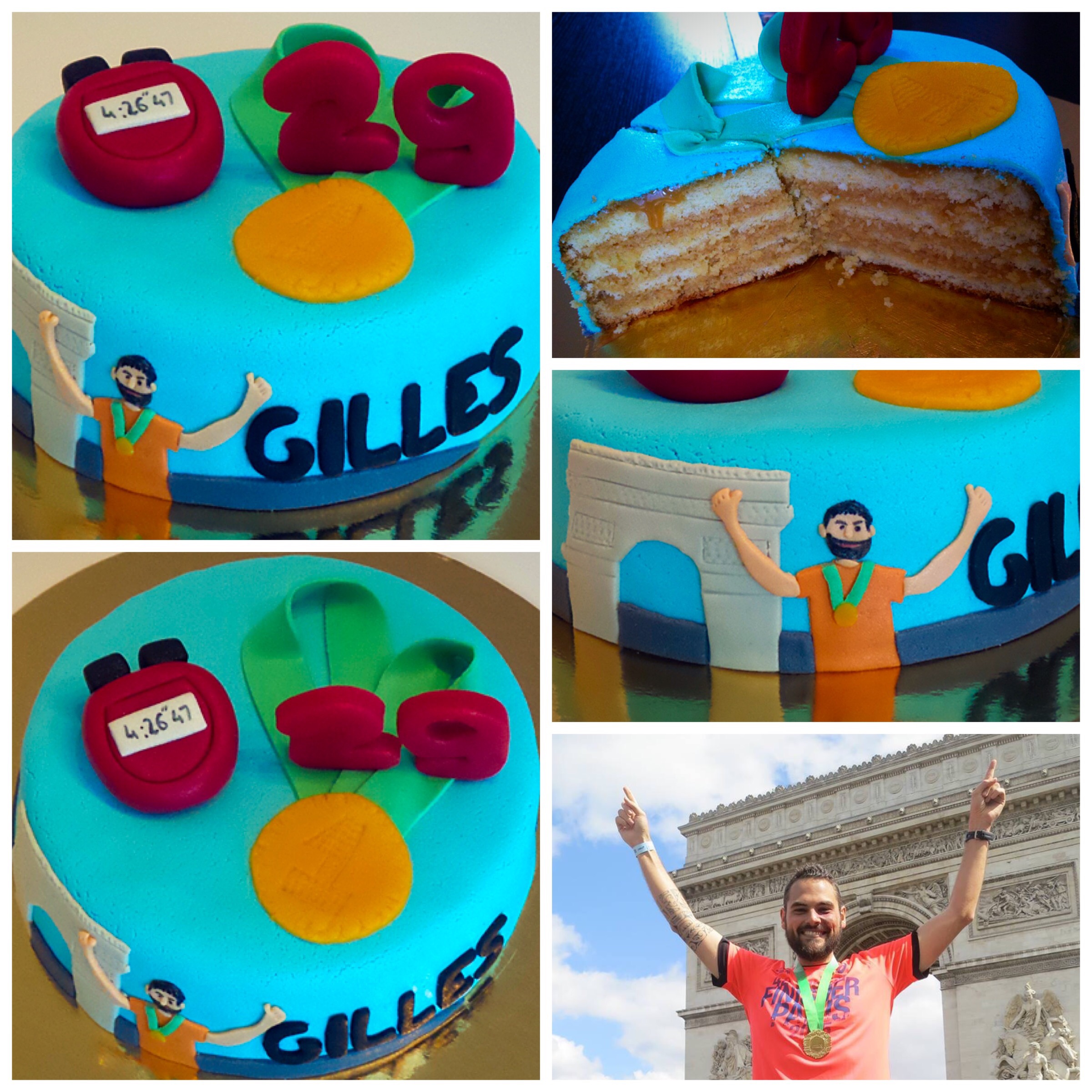 Pour fêter l’anniversaire de Gilles, Florie voulait un gateau sur le thème de la course. Je lui ai proposé de réaliser un gateau qui imortaliserait le super chrono de son mari au marathon de Paris. Pour la déco, je me suis basée sur la photo de Gilles au pied de l’Arc de Triomphe, arrivée du Marathon.
