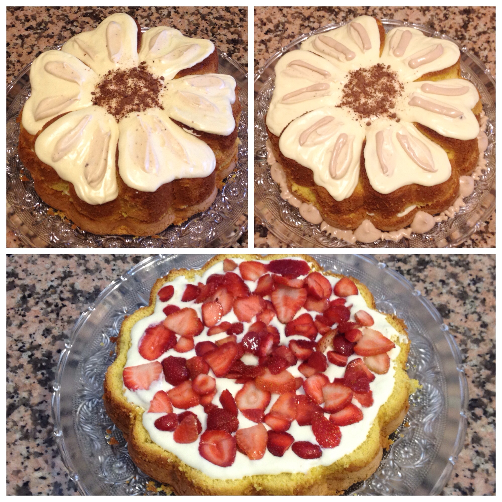 Pour plus de gourmandise, j’ai ajouté une ganache au chocolat blanc au cœur du gâteau avec les quelques fraises du jardin et au dessus pour un peu de décoration.