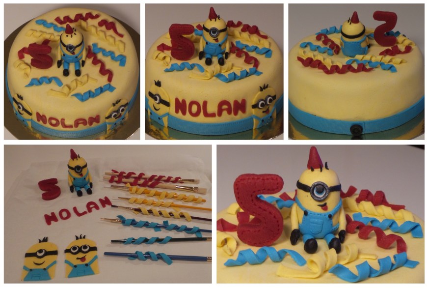 J’ai réalisé une génoise à la vanille fourrée d’une ganache chocolat noir/Nutella. Toutes les décorations, y compris le minion modelé, sont en pâte d’amande.