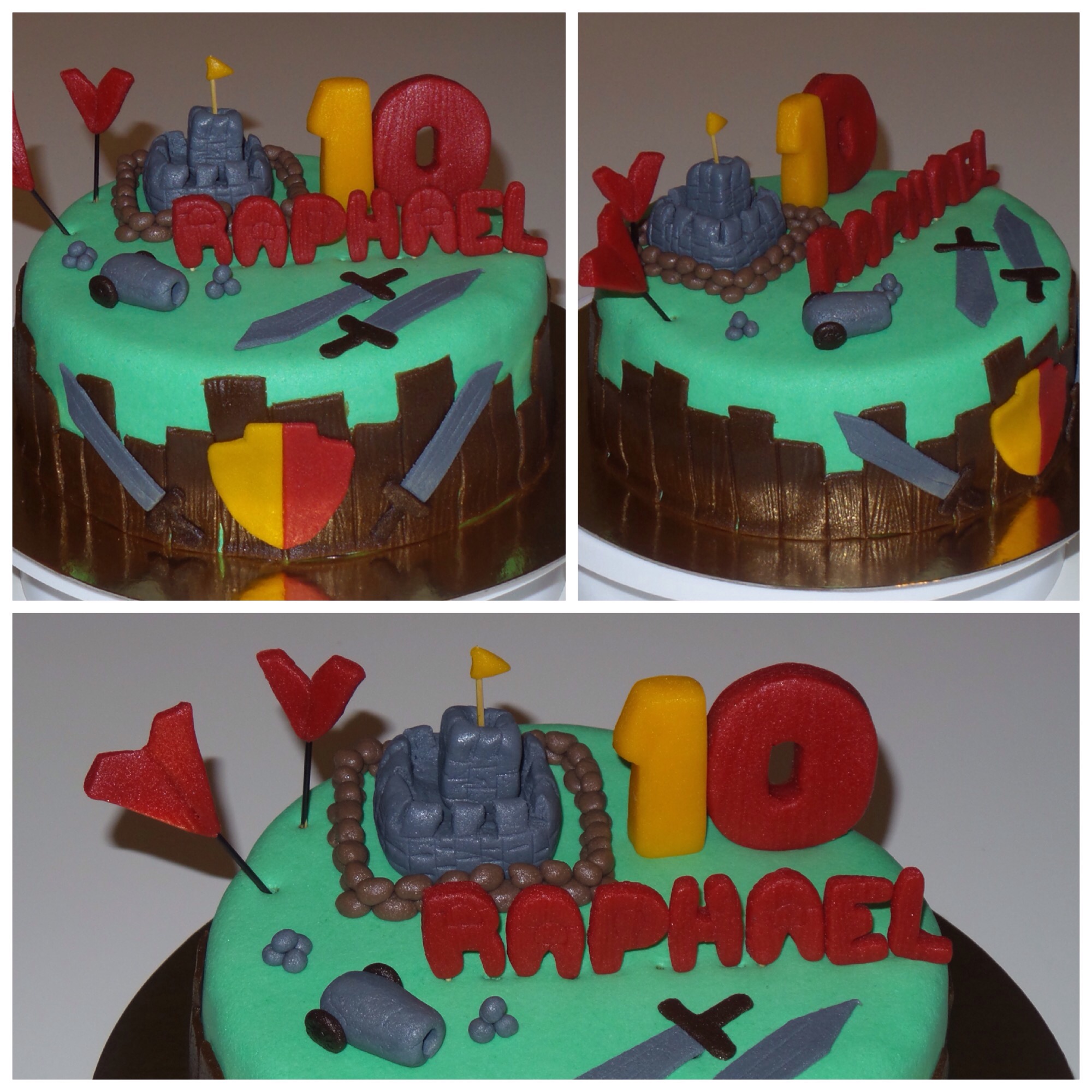 Le gâteau est une génoise au chocolat fourré d’une ganache au chocolat noir. Toutes les décorations sont en pâte d’amande.