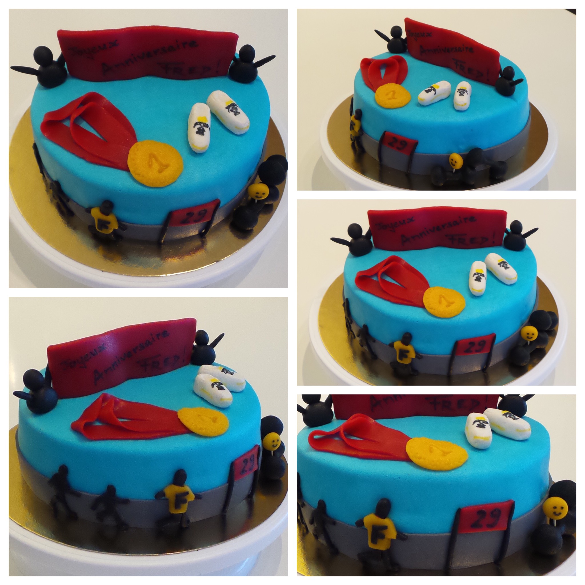 J’ai donc préparé un disque en pâte à sucre que j’ai décoré à l’aérographe (le fameux) et je lui ai fait faire 1500km dans une belle boîte pour n’avoir qu’à le poser sur le gâteau le jour J !